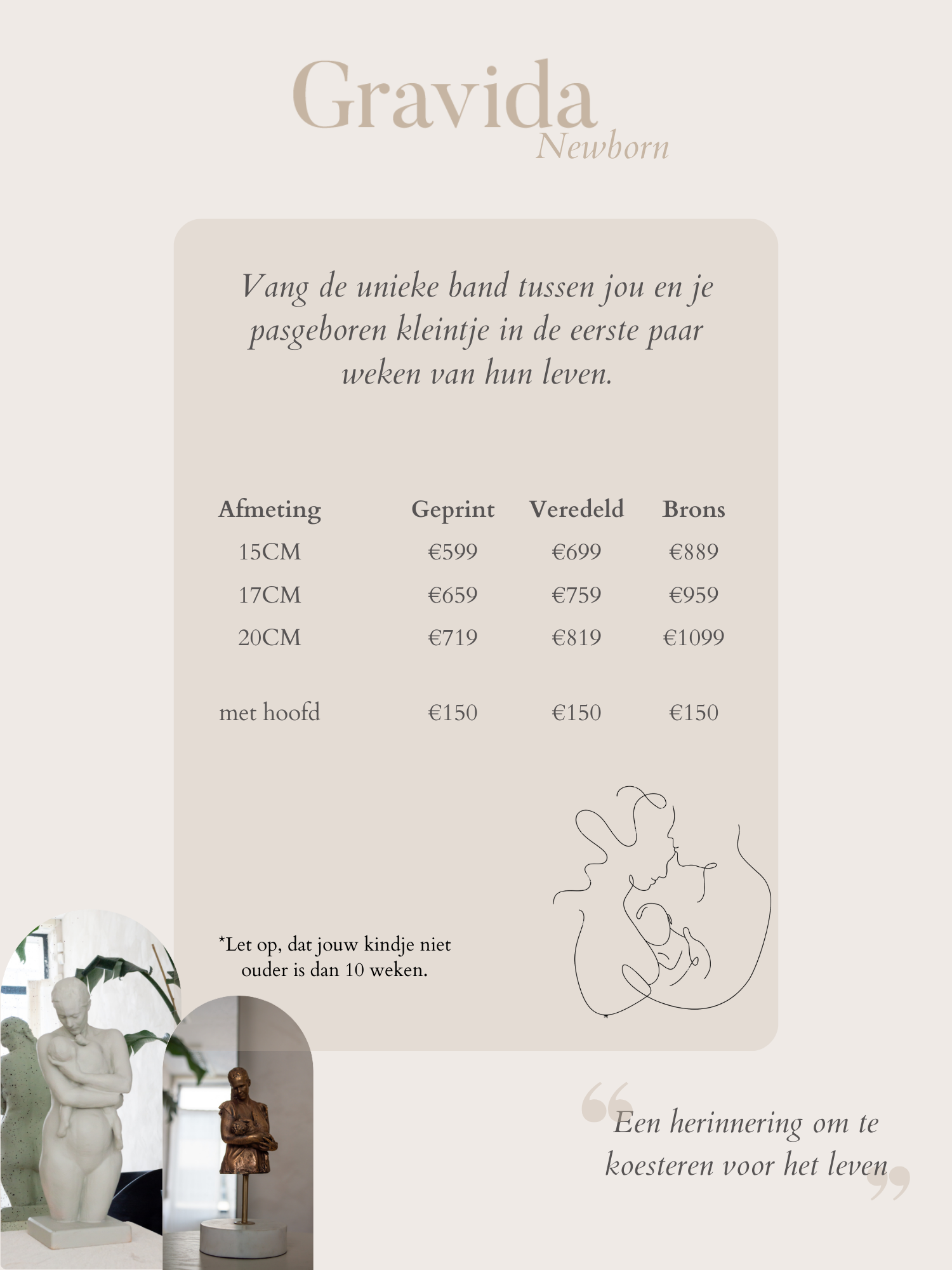 Met ons moeder en kind beeld leggen we niet alleen de liefdevolle band tussen moeder en kind vast, maar ook de tederheid en kwetsbaarheid van die kostbare kraamperiode. Het resultaat is een uniek en waardevol beeld dat voor altijd een prachtige herinnering zal zijn aan deze bijzondere tijd in jullie leven.