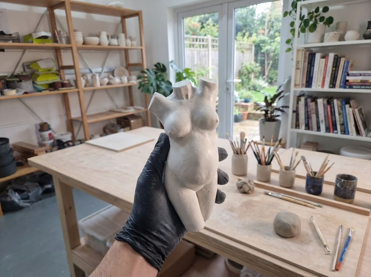 Het proces start met het maken van een 3D scan van de zwangere buik. Deze scan wordt digitaal uitgewerkt tot een sculptuur waarin houding, verhoudingen en vorm zorgvuldig worden vastgelegd. Vervolgens wordt het beeld fysiek opgebouwd en afgewerkt in naturel composiet.