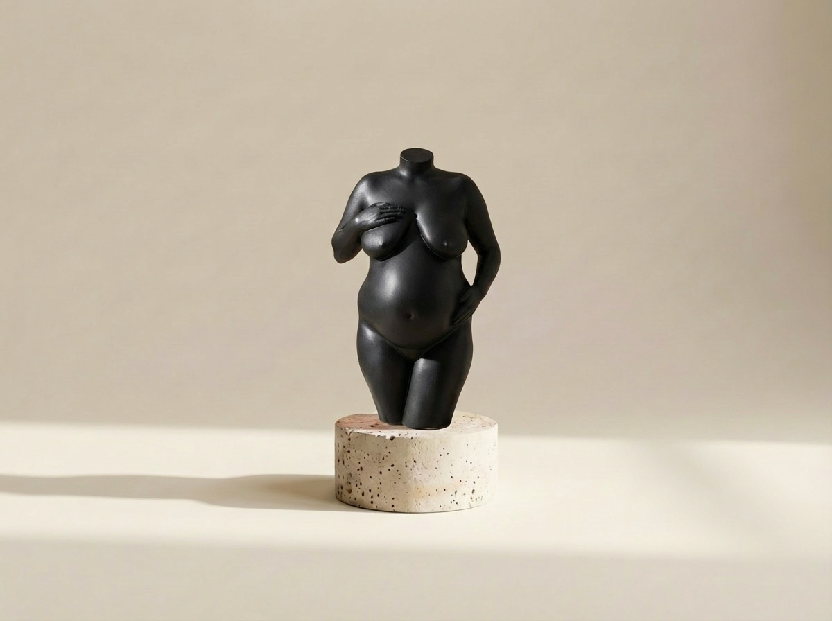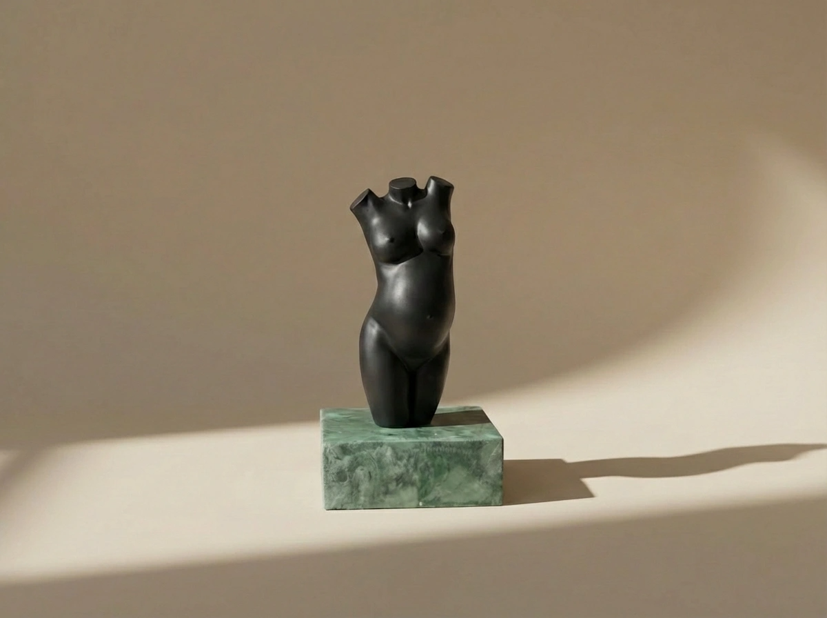 Een zwart zwangerschapsbeeld heeft een zachte, rustige uitstraling en laat de vorm van je zwangerschap op een verfijnde manier tot zijn recht komen. De donkere tint zorgt voor een tijdloos beeld dat zich moeiteloos voegt in verschillende interieurs, zonder de aandacht op te eisen.