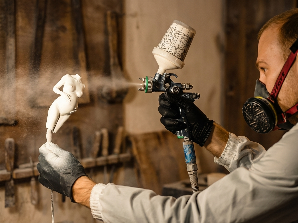 Onze beelden worden altijd opgebouwd in resin en daarna in het atelier met de hand nabewerkt. Denk aan schuren, zandstralen en het zorgvuldig aanbrengen van de afwerking. Daardoor zijn kenmerkende printlagen niet zichtbaar en krijgt elk beeld een rustige, verfijnde uitstraling.