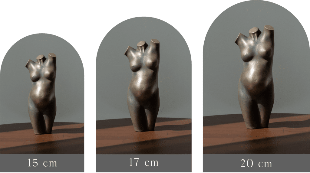 Zodra je zwangerschapsbeeld is gespoten in het metaal van jouw keuze, wordt het nabewerkt als een volwaardig metalen beeld. We verzwaren de veredelde zwangerschapsbeeldjes standaard, zodat ze ook zoveel mogelijk voelen als massief metaal. Veredelde beelden van je zwangere buik ijn mogelijk in gepatineerd brons of koper en in gepolijst goud, zilver en staal kleur.